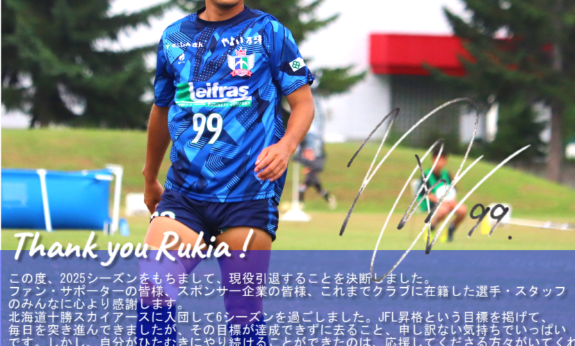 北海道十勝スカイアースに入団して6シーズンを過ごしました。JFL昇格という目標を掲げて、毎日を突き進んできましたが、その目標が達成できずに去ること、申し訳ない気持ちでいっぱいです。しかし、自分がひたむきにやり続けることができたのは、応援してくださる方々がいてくれたからです。